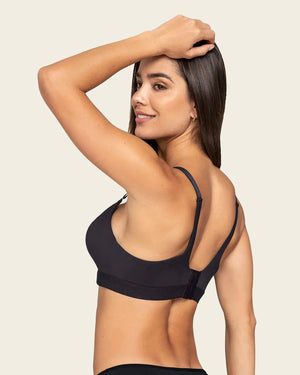 -Comfortable bra with high-cut, smooth cups, higher part in the armpit area, no padding, double fabric.