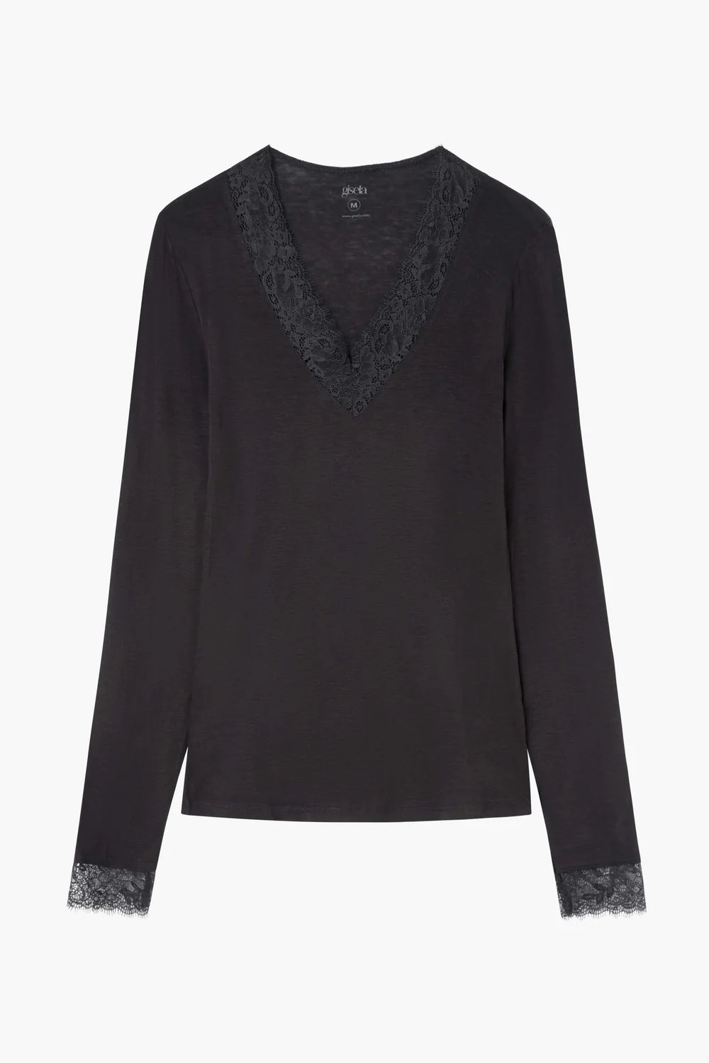 - Termo apatiniai marškinėliai ilgomis rankovėmis, puošti nėriniuotu akcentu „V“ formos iškirptėje ir rankogaliuose.